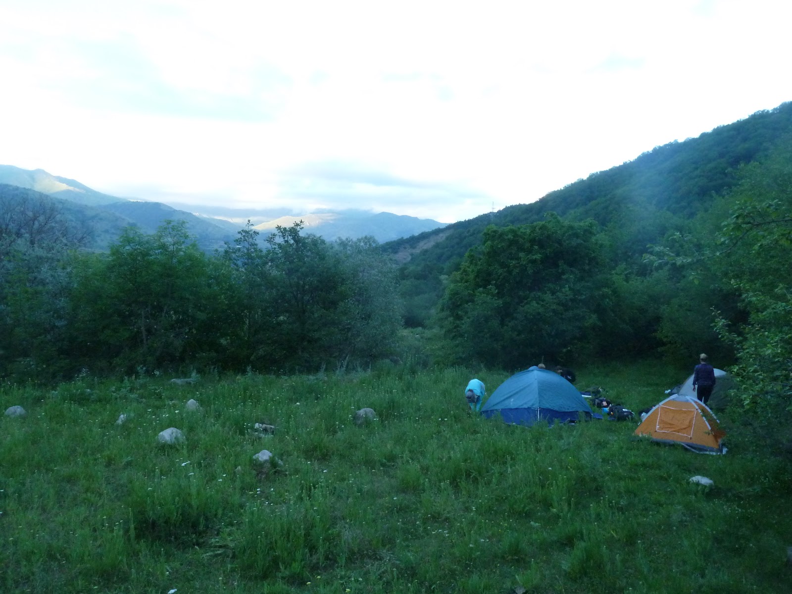 The weather cooled down as we descended repeated switchbacks, and around 7pm we arrived in the little town of Kadjaran, scenically situated in a narrow valley below piles of tailings from the copper and molybdenum mine. But Switzerland was still visible in the west: that makes up for a whole lot of tailings. In some outdoor restaurant we had pork khorovats, lavash, and tomato and cucumber. Yum.